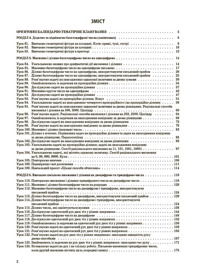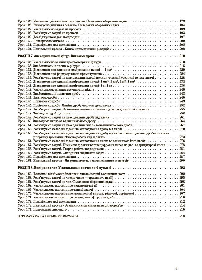 Посібник містить орієнтовне календарно-тематичне планування та розробки уроків математики у 4-му класі Нової української школи, складені відповідно до вимог нового Державного стандарту початкової освіти (2018) за Типовою освітньою програмою авторського колективу під керівництвом О. Я. Савченко.