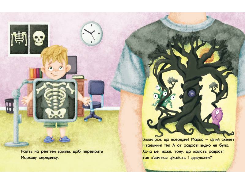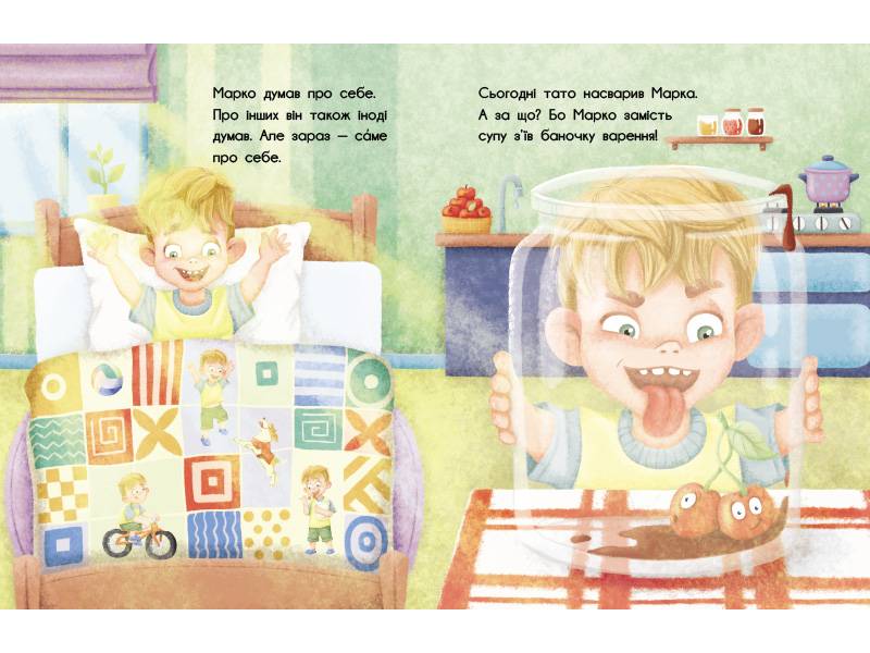 Усі люди неповторні ззовні й усередині та наповнені всякою всячиною, яка здатна постійно змінюватися. У цьому переконався Марко з оповіді Оксани Давидової. От у ньому, наприклад, вишневе варення, смуток, радість, скелет і таємничі тіні… Хлопчик досліджує себе, Дружка, тата й сестру. А особливо — маму, у якої всередині таємниця. А що у вас?