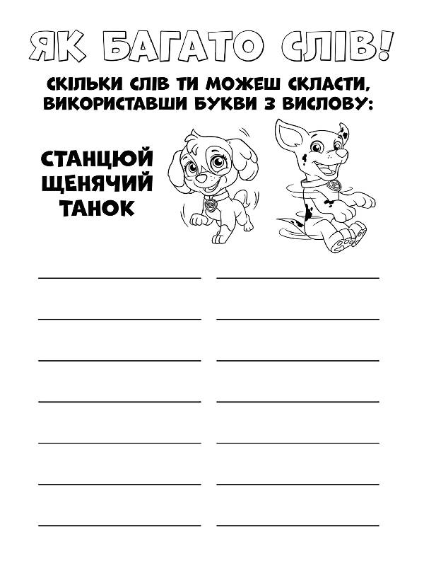 Щенячий Патруль, як завжди, готовий діяти! Приєднуйтесь до улюблених героїв і вирушайте назустріч кольоровим пригодам. Малюйте, розфарбовуйте, римуйте, проходьте лабіринти, шукайте слова, рахуйте та виконуйте безліч цікавих завдань разом із командою Щенячого Патруля!