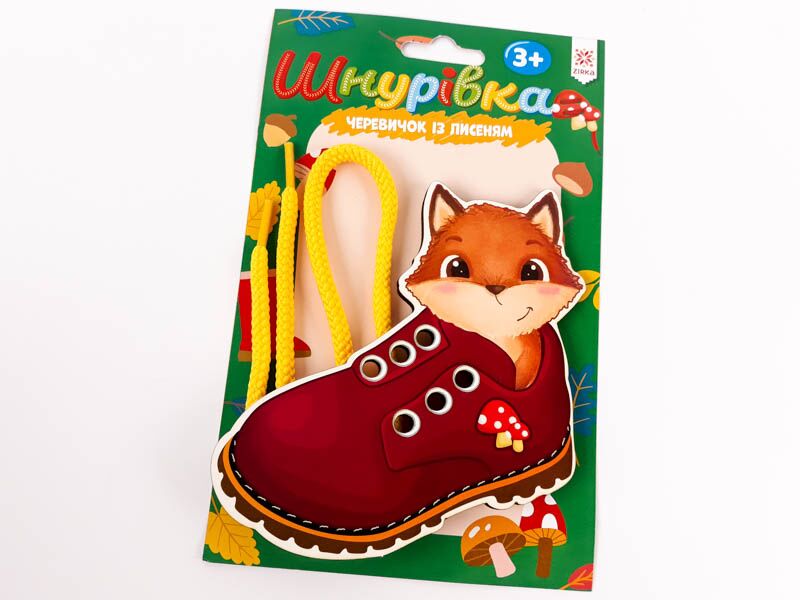 Шнурівка Черевичок із лисеням Зірка. Розвиваюча іграшка-шнурівка «Черевичок із лисичкою» / «Черевичок із ведмедиком» / «Кед із єдиноріжкою» / «Кед із зайченям» – це мила іграшка для малюка, яка буде розвивати дрібну моторику, увагу, спостережливість, кмітливість та логіку дитяти. А ще – фантазію, бо зашнуровувати взуття можна у різний спосіб! Види шнурування показано на звороті європідвісу. У комлекті - дерев'яна кольорова іграшка для навчання та шнурівка. Розмір іграшки 110х120 мм.