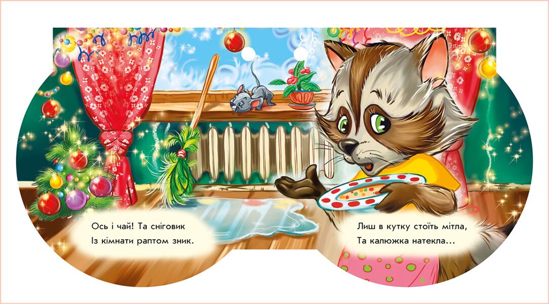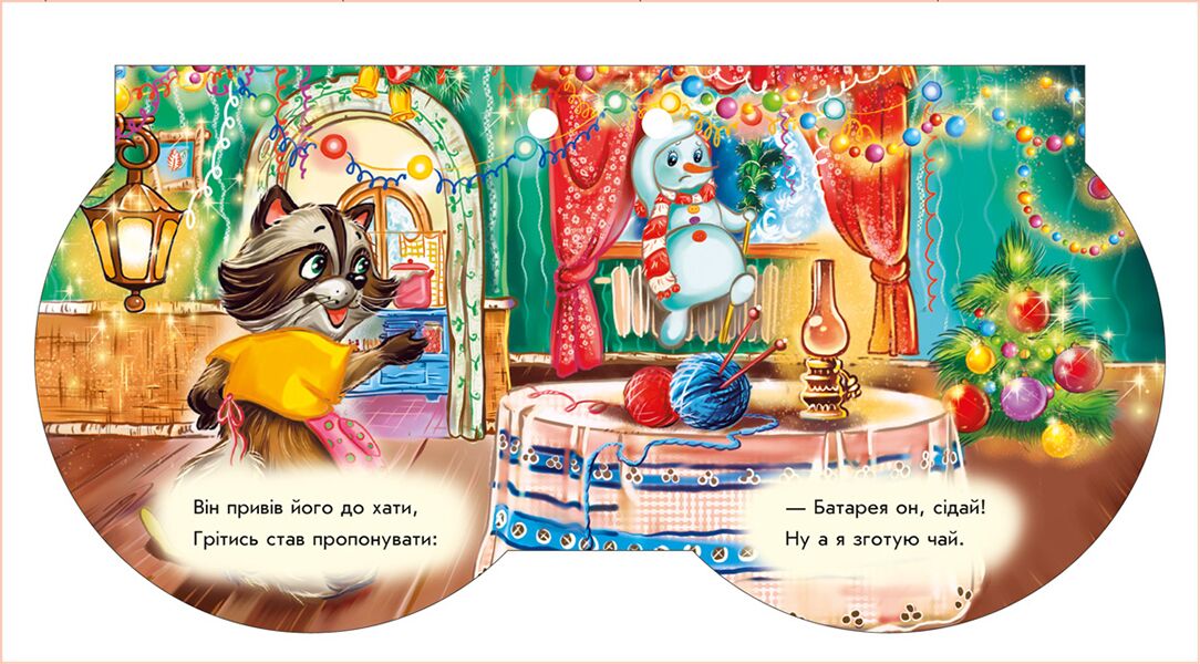 Книжка-іграшка, якою можна прикрасити ялинку. Добра святкова історія у віршах про єнота, який привів свого друга сніговика погрітися в будинок і загубив його.