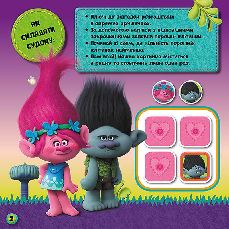Ласкаво просимо до світу тролів від DreamWorks! Зустрічай веселих, крутих, різнобарвних героїв. Поринь разом із ними у нові "логічні" пригоди. Шукай цікаві головоломки на сторінках цієї книжки. Вирішуй складні завдання за допомогою наліпок. Судоку - це більше ніж розвага!