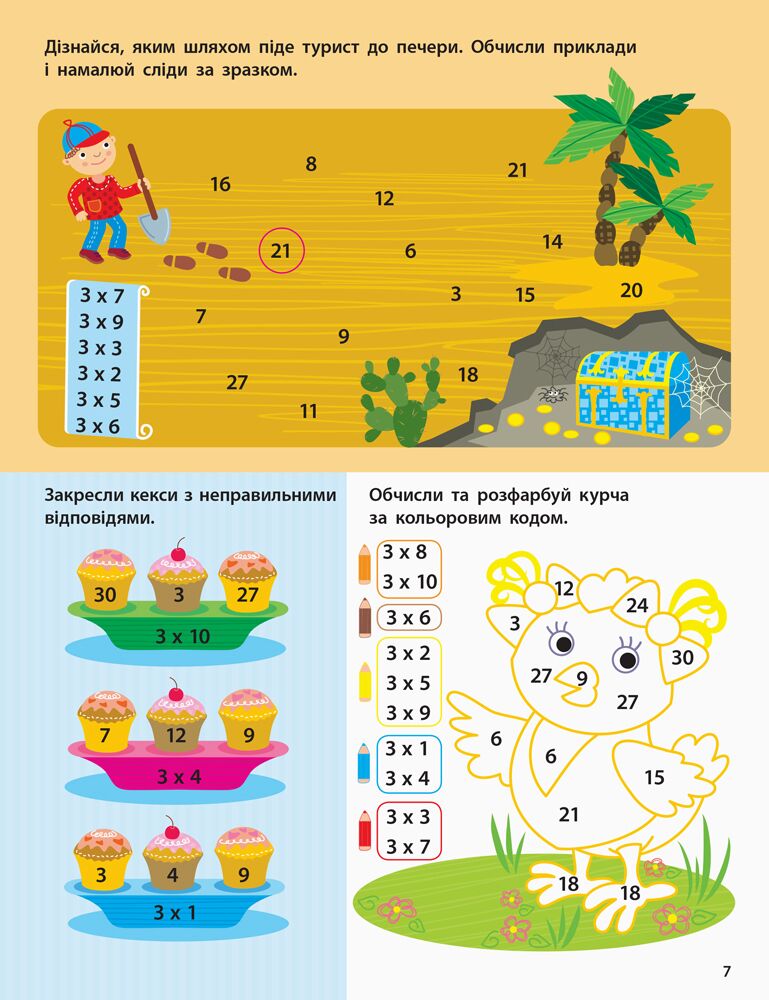 Збірник допоможе дитині вивчити таблицю множення, виконуючи практичні вправи. Кожне завдання — це головоломка, ребус, загадка, розмальовка або лабіринт. А для кращого запам’ятовування таблиці є спеціальні підказки.