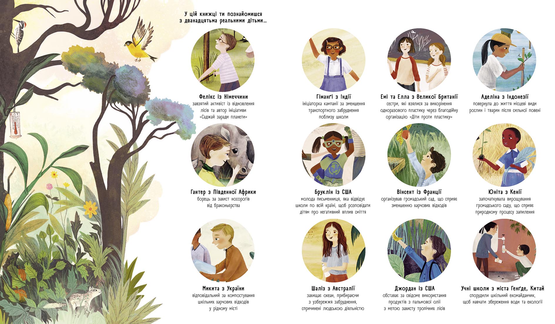 Як дитина може врятувати планету? Наприклад, прочитавши цю книжку. Тут уміщено розповіді про дванадцятьох школярів-екоактивістів з усього світу, які мотивують не лише дітей, але й дорослих. Герої книжки свідомі, небайдужі, вигадливі, тож роблять усе можливе для збереження довкілля. Хтось захищає носорогів в Африці, хтось прибирає узбережжя в Австралії, а хтось компостує сміття в Україні.