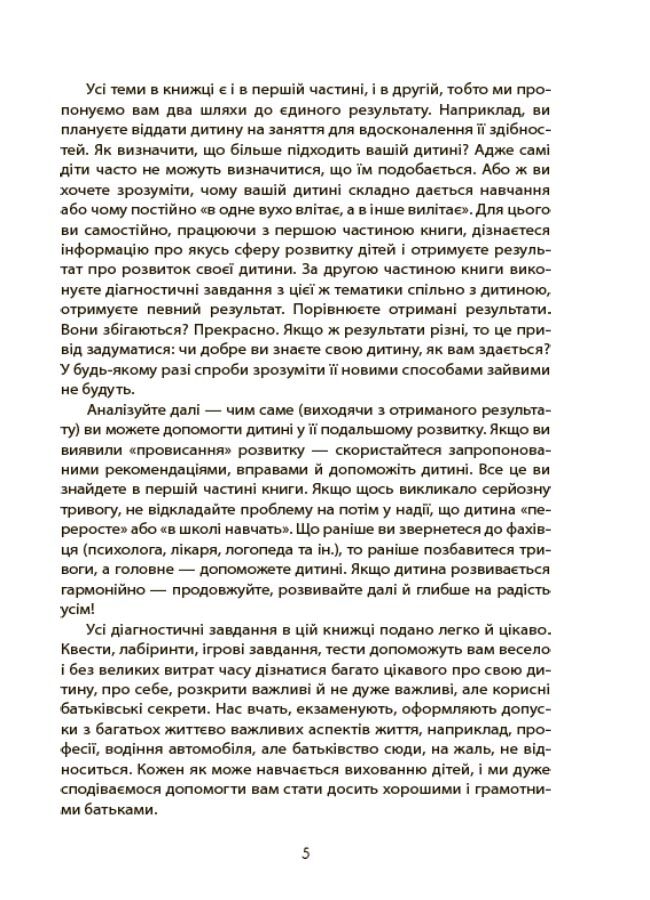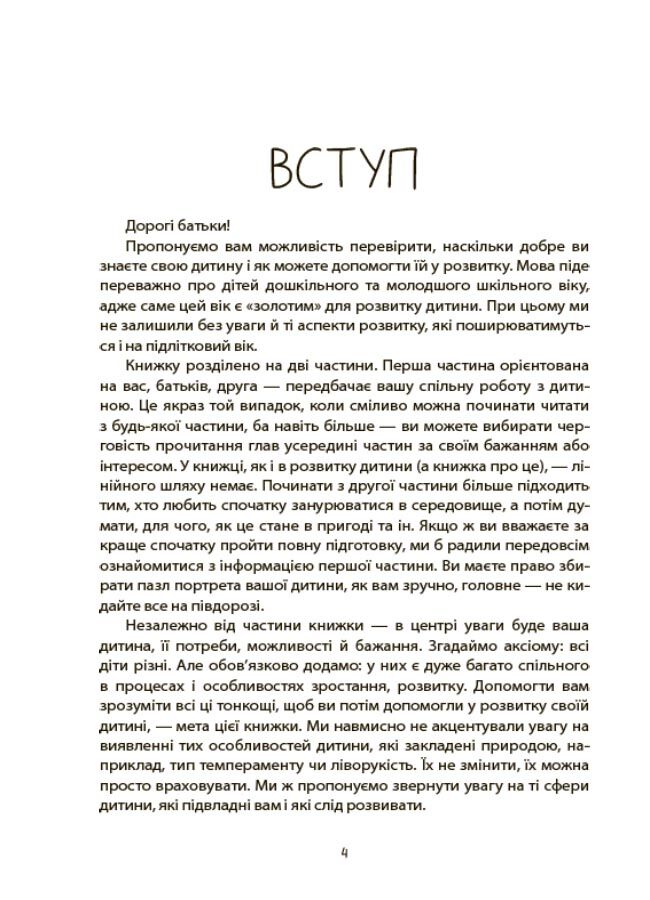 Як не вимагати від дитини зайвого? Віддати на танці чи в математичну школу, якщо вона сама не знає, чого хоче? Чому їй складно дається на- вчання або чому постійно «в одне вухо влітає, а в інше вилітає»? Відповідь на всі питання проста — вивчайте свою дитину і підтримуйте її розвиток. А ця книжка вам допоможе! Перша її частина орієнтована на вас, батьків, друга — передбачає вашу спільну роботу з дитиною.