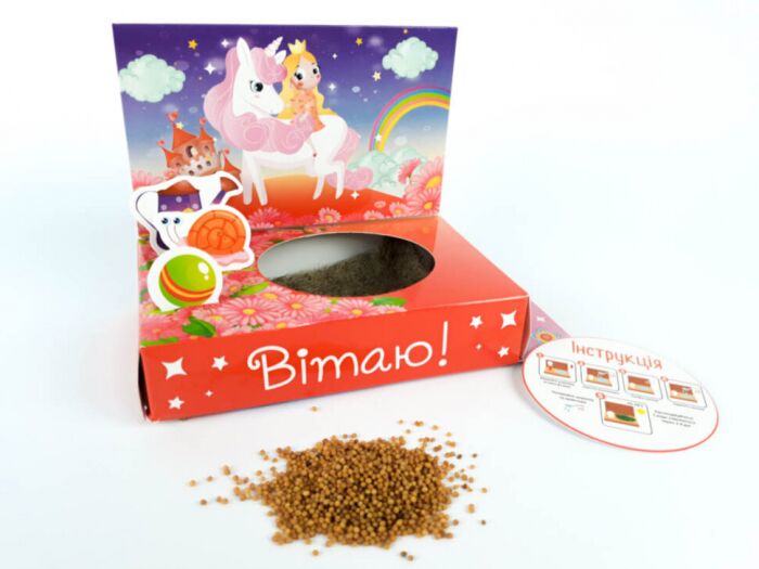 Фігурки, які містяться у комплекті, перетворять дослід у чудову гру! Набір складається з: об'ємної листівки, 3 картонних фігурок для декорування, контейнеру для садіння насінин, агрокилимка для вирощування рослин, насіння гірчиці, інструкції. Розміри 16 х 8 х 3 см
