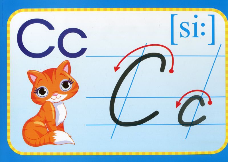 Кожен зразок містить модель англійської літери, написаної з дотриманням правил каліграфії, з відповідними стрілками та поясненнями, що показують порядок та напрям написання кожної літери. Цей матеріал допомагає дітям вивчати алфавіт та розвивати навички каліграфії, покращує їхнє рукописне письмо.