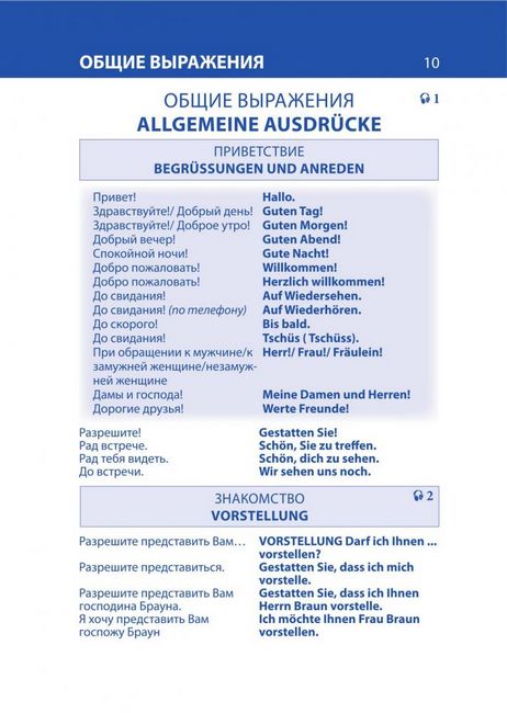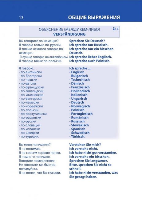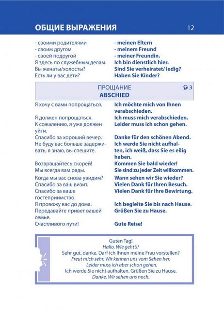 Разговорник составлен на основе общеупотребительной лексики, сгруппированной по тематическим разделам: Путешествие автомобилем, Путешествие поездом, Путешествие самолетом, Путешествие кораблем, Городской транспорт, Велосипед, Туристическое агентство, Отпуск, Каникулы, Отель, Семья, Жилье, Ресторан, Меню, Банк, Почта, Телефон, Покупки, Здоровье, Культура, Спорт и игры, Время, Времена года, Числа, Вес и размер. В основной части представлены слова и выражения, употребляемые при знакомстве, приветствии, прощании, в разговоре о погоде, профессии, семье и т.д. В конце книги подан небольшой украинско-немецкий и немецко-украинский словарь. Вся эта информация содержится в mp3 файлах, ссылки на которые расположены на нашем сайте. Эти аудио-файлы можно бесплатно скачать по специальному коду, который указан в каждом экземпляре разговорника. Разговорник рассчитан на иностранцев, учителей, учащихся, а также всех, кто изучает разговорный немецкий и русский язык.