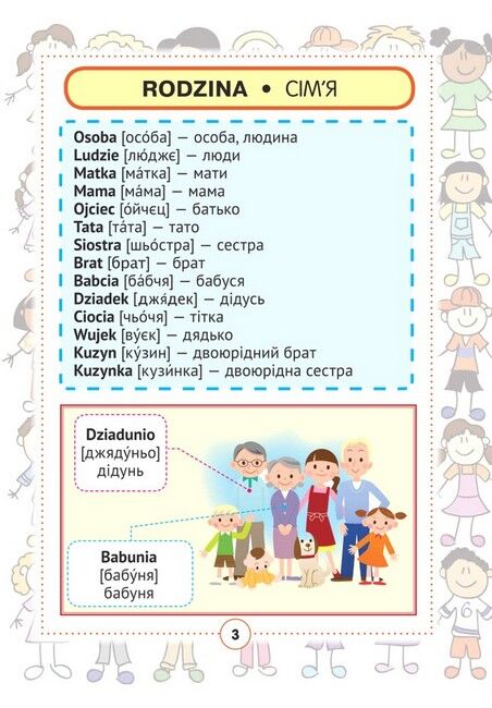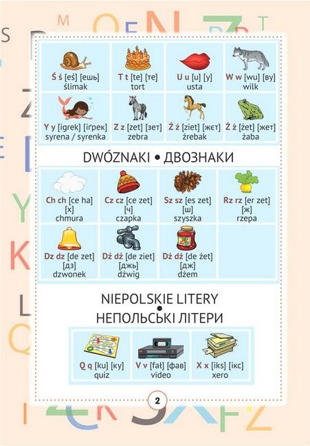 Польско-український візуальний словник містить близько 2000 слів і словосполучень із 68 лексичних тем. Для кращого засвоєння мовного матеріалу пропоновані слова і сполучення слів проілюстровані малюнками. лексичний матеріал підібрано відповідно до чинних програм з іноземних мов нової української школи. Правила читання, таблиця неправильних дієслів і транскрипція (запис вимови польских слів українськими буквами) значно полегшать вивчення польскої мови. Призначений для учнів початкових класів, їхніх батьків і вчителів.