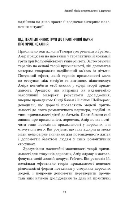 Ми вже давно покладаємося на науку, яка підказує нам, що їсти, коли займатися спортом і скільки спати. То чому б не використати її, щоб поліпшити наші стосунки? У цій революційній книзі вчені д-р Амір Левін і Рейчел Геллер науково пояснюють, чому одні люди, на позір, без зусиль створюють міцні й довірливі стосунки, а інші відчувають труднощі. Дізнайтеся, як теорія прихильності дорослих — найрозвиненіша наука про стосунки, яка існує на сьогодні, — може допомогти нам знайти і зберегти своє кохання.