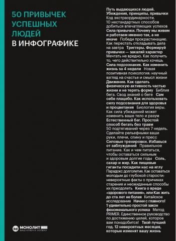 В этом издании содержится 50 инфографик, созданных на базе самых востребованных книг-бестселлеров, посвященных формированию полезных привычек: