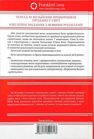 За 30 років успішних перевидань однієї з кращих бізнес-книжок світу Стівен Кові надихнув на рішучі зміни у житті мільйони людей, серед яких і його власні діти. Продовжуючи дослідження батька, Шон Кові доповнив ювілейне видання новими розділами, в яких адаптував універсальні 7 звичок до вимог та викликів сучасності.
