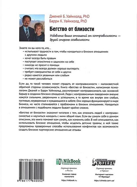 В книге «Бегство от близости» Берри и Дженей Уайнхолд рассказывают читателям, как распознать людей с контрзависимостью и помочь им. А если вы узнали себя в приведенном выше описании, в книге вы найдете методы, которые поспособствуют вашему изменению. Авторы учат читателей в уже имеющихся отношениях избавляться от детских травм, предлагают проверенные способы разрешения конфликтов и возможность для создания близких партнерских отношений.