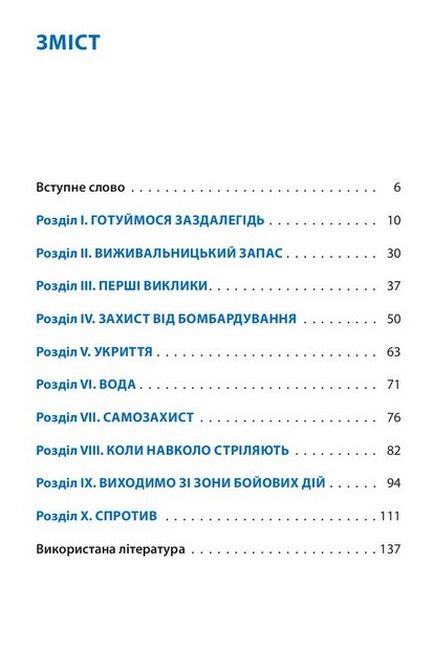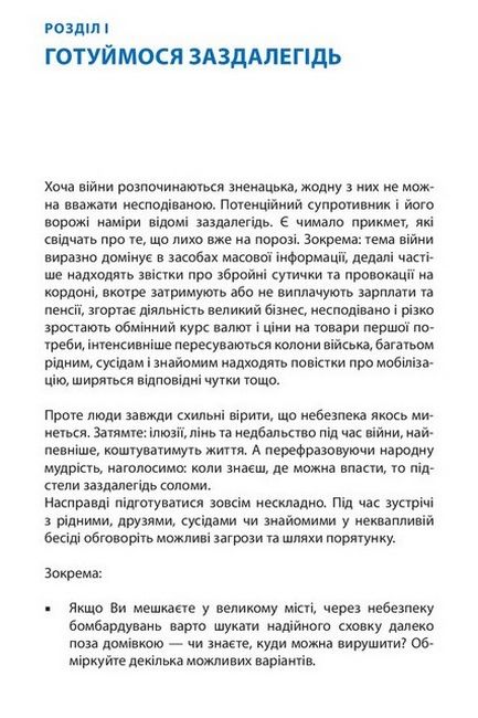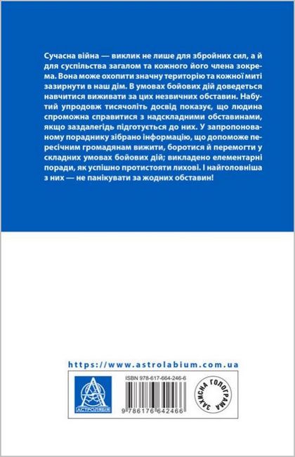Сучасна війна — виклик не лише для збройних сил, а й для суспільства загалом та кожного його члена зокрема. Вона може охопити значну територію та кожної миті зазирнути в наш дім. В умовах бойових дій доведеться навчитися виживати за цих незвичних обставин. Набутий упродовж тисячоліть досвід показує, що людина спроможна справитися з надскладними обставинами, якщо заздалегідь підготується до них. У запропонованому пораднику зібрано інформацію, що допоможе пересічним громадянам вижити, боротися й перемогти у складних умовах бойових дій; викладено елементарні поради, як успішно протистояти лихові. І найголовніша з них — не панікувати за жодних обставин!
