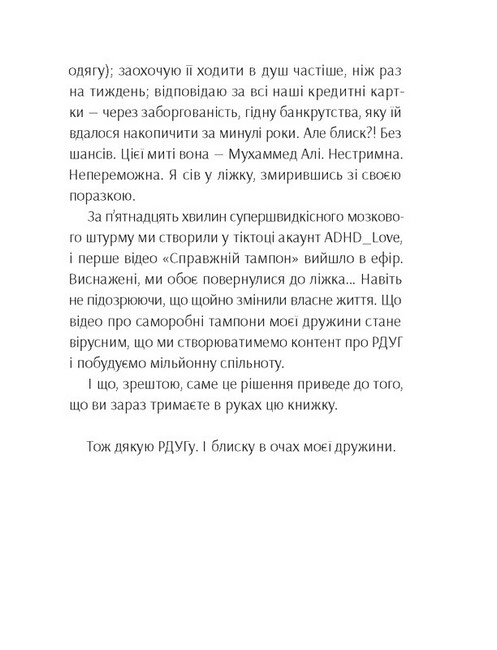 Людей із розладом дефіциту уваги з гіперактивністю (РДУГ) досі називають неорганізованими холериками чи лінивими геніями. Автори цієї книжки, тікток-інфлюенсери Річ і Рокс, розповідають про щоденні виклики людей із РДУГ і їхніх близьких. На прикладі власного життя вони у легкій манері діляться порадами, як не втрапити у пастку самозасудження і жити на повну попри всі перешкоди буденності.