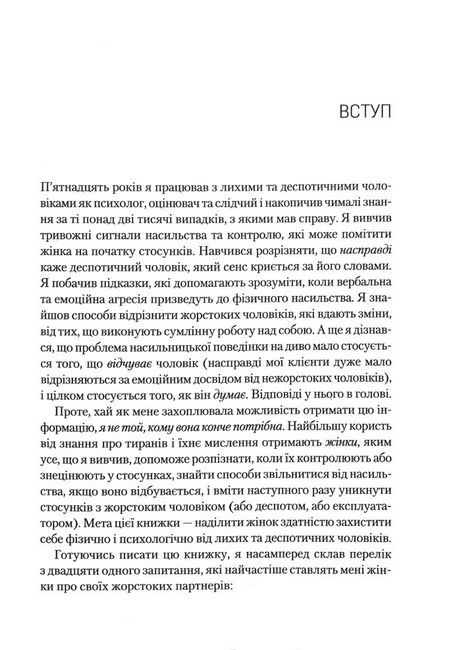 «Він каже, що дуже сильно мене кохає. То чому він так зі мною поводиться?» — питання, над яким не варто загадуватися. Натомість починайте діяти. З усього видно, що ваш партнер — деспот, який контролює ваше життя насильством. Не пропустіть перші тривожні дзвіночки, вловіть напрям його образливих думок, не міфологізуйте, а класифікуйте кривдників за найпоширенішими типами. Об’єктивно оцініть роль наркотиків і алкоголю в аб’юзивних стосунках, з яких вас безпечно виведе ця книжка, і шукайте щастя у здоровій парі! А розрубрикована Бенкрофтом психологія мучителів стане запорукою вашого «ніколи знову».
