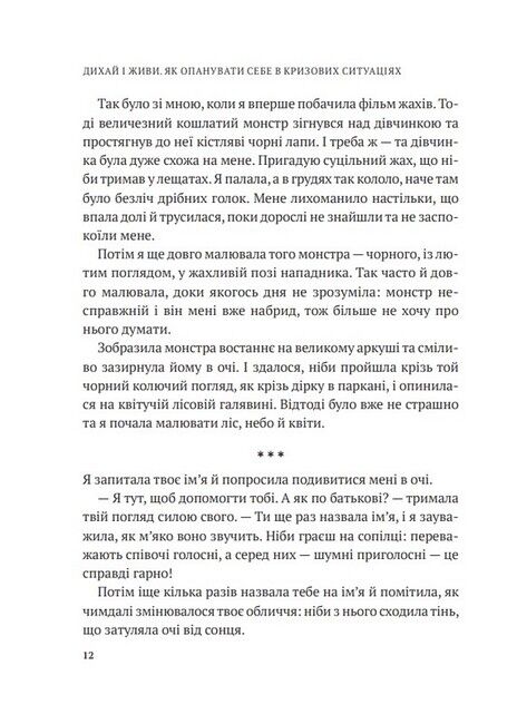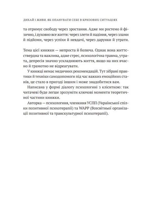 Посібник «Дихай і живи» повертає до життя через любов. До нормального життя. Попри війну. Ці ефективні психологічні техніки та вправи можна застосовувати, коли йдеться про тривогу, стрес, ПТСР, психологічну травму, втрату, провину вцілілого, депресивні стани. А що почасти книжку написано як діалог психологині з клієнткою, то замість нудьги від сухої теорії читач відчуває присутність у своєму житті психолога, з яким можна «на ти» і який запитує «Як ти?».