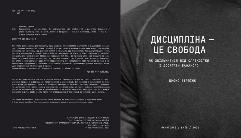 Як перестати їсти стільки солодкого? Як навчитись рано прокидатись? Як змусити себе робити фізичні вправи? Книжка офіцера військово-морського флоту США, автора бестселерів та інструктора з лідерства Джоко Віллінка допоможе вибудувати стратегію впорядкованого життя. У ній автор пояснює, як, завдяки дисципліні, можна навчитись контролювати свої страхи, лінощі, погані звички і, зрештою, дійти до гармонії в житті.