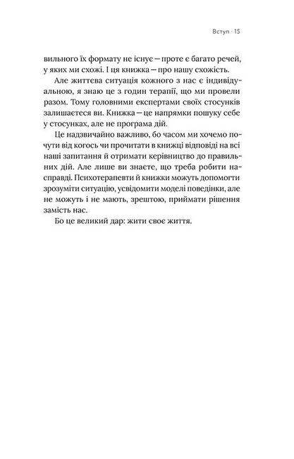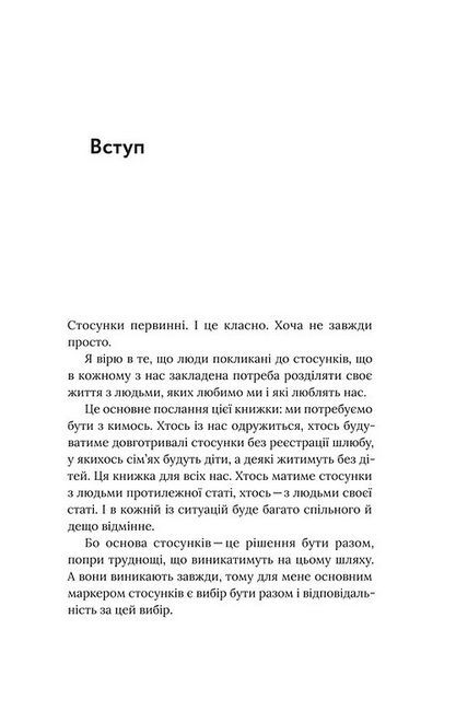 Коли вирішуємо будувати стосунки, ми маємо запам'ятати: правильних рецептів не існує, кожен торуватиме свій неповторний шлях. Хтось одружиться, а хтось будуватиме довготривалі взаємини без офіційної реєстрації шлюбу. У когось будуть діти, а хтось житиме без них. Одні будуть разом з людьми протилежної статі, інші — з людьми своєї статі. У всіх цих ситуаціях буде щось спільне, а щось тільки ваше, особливе.