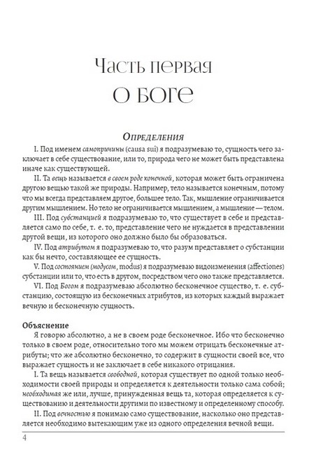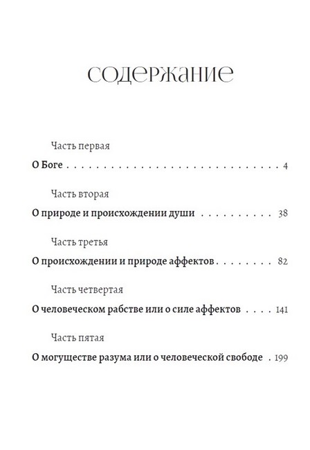 В этой книге философ излагает свои мысли о Боге, об эмоциях и их власти над человеком, а также о могуществе человеческого разума. Произведение очень структурировано — к каждой теории автор подает доказательство и выводы.