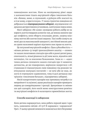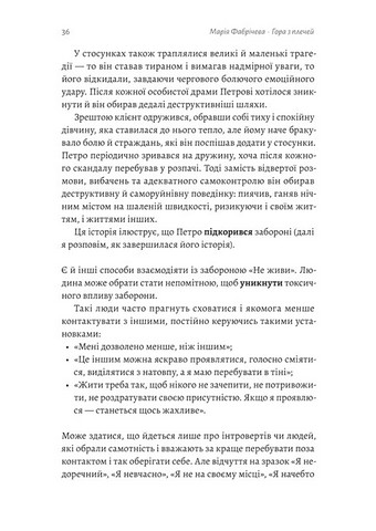 \nПроте психологічні заборони — це не вирок. «Гора з плечей. Як виявити і подолати 13 психологічних заборон», наповнена конкретними порадами і вправами, надихає взяти відповідальність за своє сьогодення, активізувати внутрішні ресурси і наважитися врешті скинути ту важку гору з плечей.
