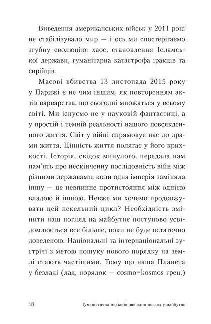 Чому людина у пошуку щастя безліч разів створює хаос та страждання? Як вийти з конфлікту і віднайти мир? У цій праці, напрочуд особистій, Жаклін Моріно повертається до історичних, культурних та духовних джерел гуманістичної медіації, яку вона розробила, практикувала та викладала понад тридцять років спочатку у Франції, а згодом в інших країнах (у юридичній, виховній, освітній, соціальній та інтернаціональній сферах). Медіація приймає безлад і робить парадоксальну пропозицію: зустріти зло, що ранило колись і турбує зараз. Безпосередньопід час «сепаратної» зустрічі вона пропонує сторонам конфлікту можливість трансформувати втрату відносин і відчай у новий погляд на майбутнє як на подорож шляхом миру та злагоди. Медіація вчить слухати і пізнавати себе, готує до зустрічі із своїм справжнім Я та іншою людиною. Деструктивна енергія, отже, може нести можливість народження та відродження, метаної та перетворення.