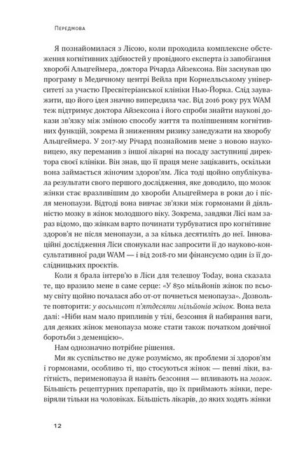 У цій книжці Ліса Москоні порушує теми, які медицина стигматизувала століттями. Авторка розповідає про когнітивне здоров’я і сумну статистику (2/3 пацієнтів із хворобою Альцгеймера — жінки), чому пацієнток не можна лікувати за «чоловічими стандартами», як естроген впливає на пам’ять, що змінюється в організмі під час статевого дозрівання, вагітності, припинення менструації тощо. Москоні дає дієві й науково обґрунтовані поради, привертає увагу до проблем жінок із післяпологовою депресією чи під час менопаузи.