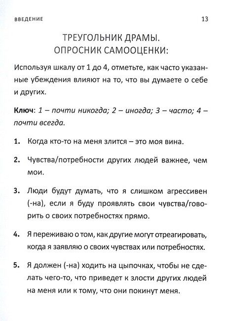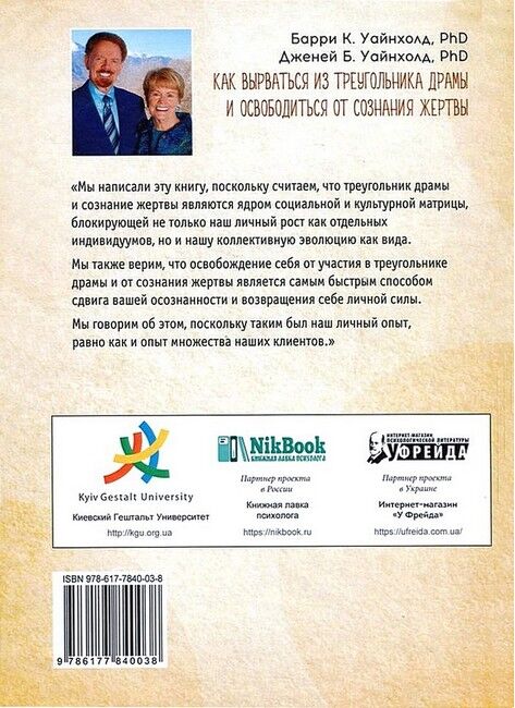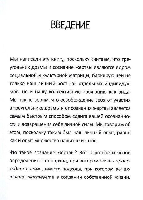 Осознание того, какое влияние динамика треугольника драмы оказывает на Вашу жизнь, возможно заставит Вашу челюсть отпасть, а глаза – полезть на лоб! Мы гарантируем, что после прочтения данного практического руководства мир вокруг никогда больше не будет для Вас прежним. Вы будете способны замечать треугольник драмы повсюду: в возвышенной драматической истории Ваших друзей и семьи; в комедийных сериалах и ток-шоу, в кино и ключевых новостях; а также в тупике, в который завел себя Вашингтон*. Вы распознаете его в болтовне у кулера с водой на работе, он исказит смысл самых интимных из Ваших разговоров (включая те, которые происходят в Вашей спальне!). Так происходит потому, что в трех из любых пяти социальных транзакций имеет место динамика треугольника драмы. Эта книга сдергивает покров тайны с треугольника драмы. В книге рассматриваются исторические и социальные корни этого феномена, истоки его развития, а также даются простые и эффективные способы освобождения от данной провоцирующей конфликты динамики.