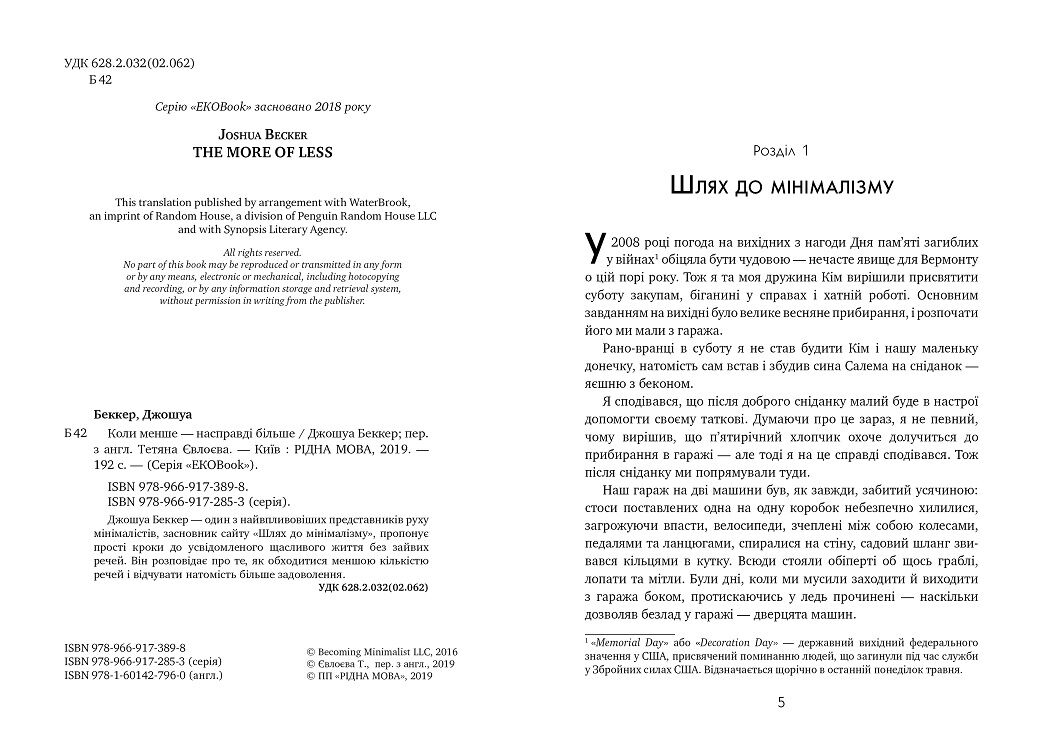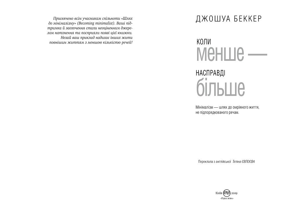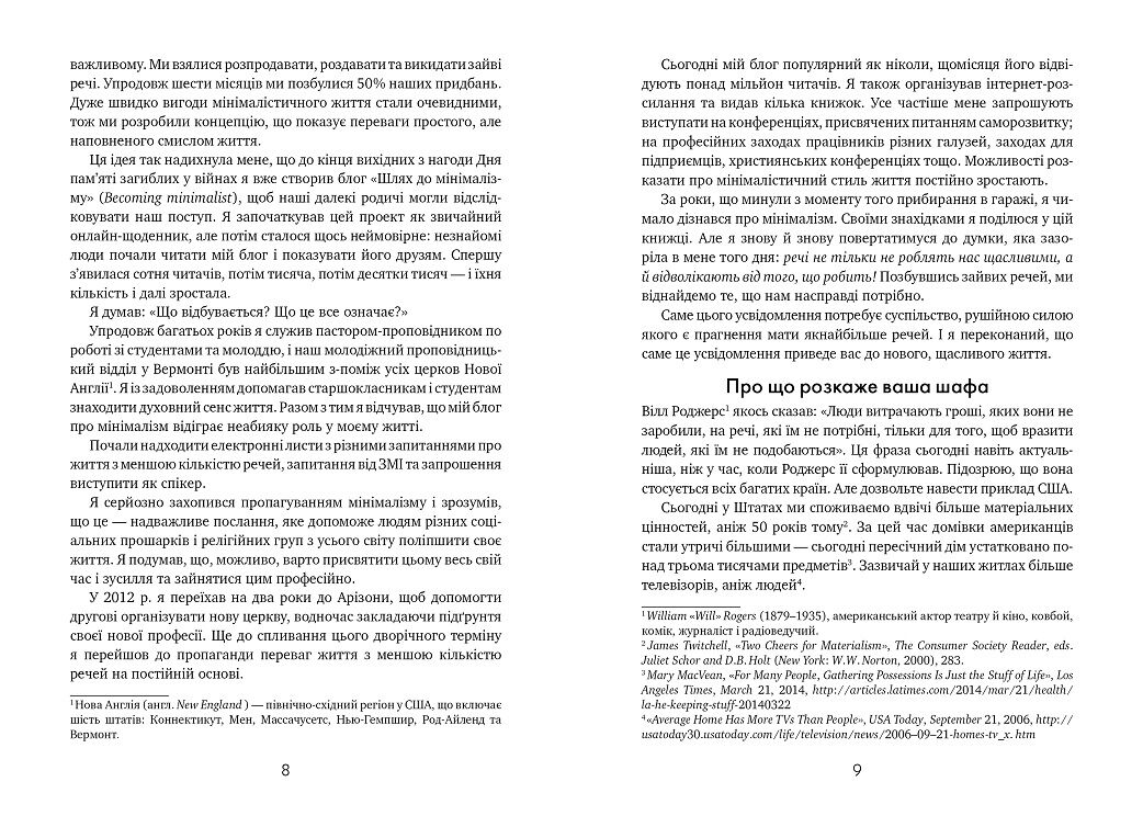 Джошуа Беккер - засновник самого впливового блогу про мінімалізм becomingminimalist.com. У той час як поняття "купувати" і "бути щасливим" стали синонімами, Джошуа стверджує, що велика кількість речей не робить наше життя кращим. Він пропонує читачам позбутися непотрібного мотлоху, перестати метушитися через дрібниці, зосередитися на дійсно важливому і прийти до мінімалізму - стилю життя, який дозволить легко досягати своїх цілей і робити мрії реальністю.