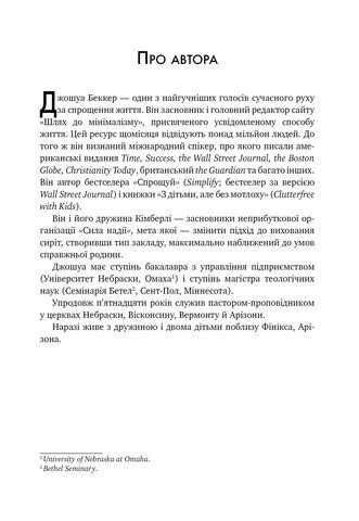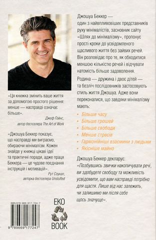 Джошуа Беккер — один з найвпливовіших представників руху мінімалістів, засновник сайту «Шлях до мінімалізму», пропонує прості кроки до усвідомленого щасливого життя без зайвих речей. Він розповідає про те, як обходитися меншою кількістю речей і відчувати натомість більше задоволення.