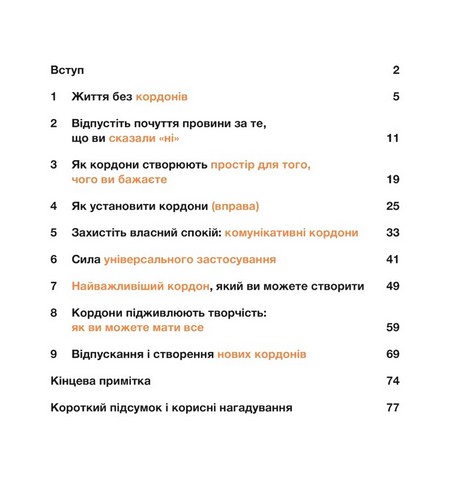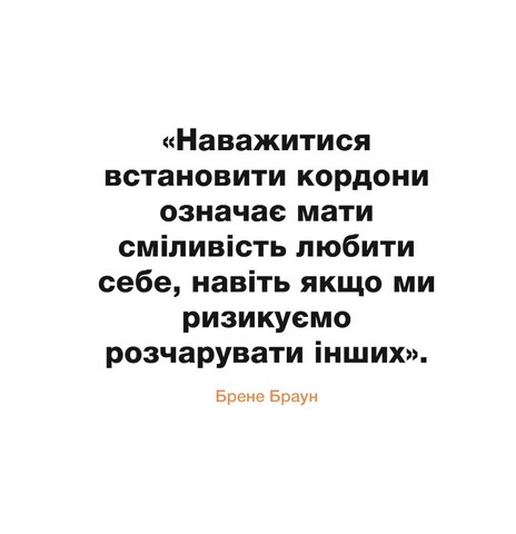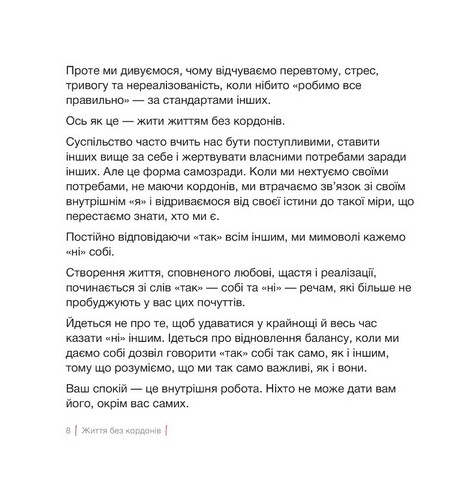 \nПрочитавши цю книжку, ви дізнаєтеся: Як сказати «ні», не відчуваючи провини. Як мирно повідомити про свої кордони так, щоб інші зрозуміли. Як навчитися правильно розчаровувати інших так, щоб на вас не вплинуло те, що вони думають про вас. Як створити кордони, які не дозволяють вам вигорати. Як зберігати спокій, хай би що відбувалося у вашому житті. Що є найважливішим кордоном, який змінює життя і дозволяє зупинити негативне мислення.