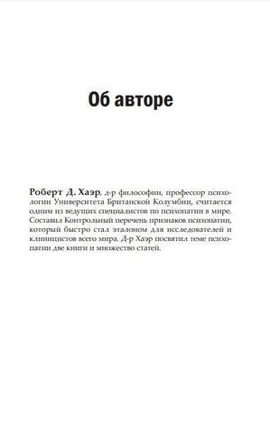 Книга известного канадского психолога д-ра Роберта Д. Хаэра посвящена психопатам — социальным хищникам, оставляющим после себя искалеченные судьбы и разбитые сердца. Автор исследует истоки феномена психопатии, факторы ее возникновения (наследственность и воспитание), предлагает практические советы по распознаванию психопатов и нейтрализации их воздействия. Книга обильно иллюстрирована примерами из клинической практики и повседневной жизни.