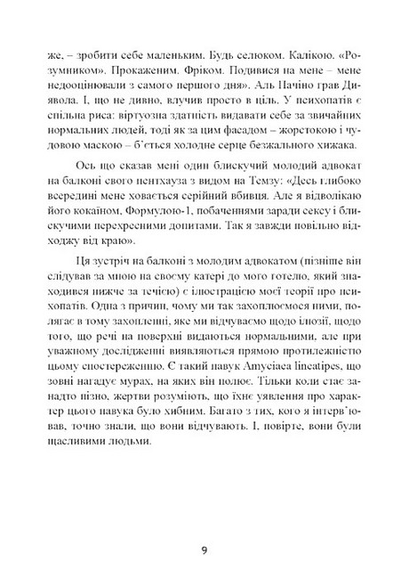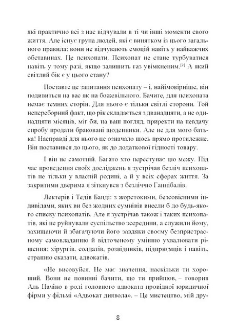 Хоч би як парадоксально це звучало, у психопатів є чому повчитися!.. Психопати не знають страху й жалості, вони чарівні, привабливі й безмежно впевнені в собі. Та й запальні вони далеко не завжди. У наш час поділ на психопатів і нормальних людей умовний, ось чому розпізнати психопата не так вже й просто. Якості, властиві психопатам, нерідко трапляються у лідерів. Відсутність жалю і готовність маніпулювати, завищена самооцінка, невичерпна чарівність і незвичайний дар переконання – все це дає їм змогу робити що завгодно і коли завгодно, абсолютно не переймаючись наслідками і не відчуваючи жодних докорів сумління. У психопатів, безумовно, є чому повчитися — їхні особисті якості та інтелект гарантують успіх у житті.