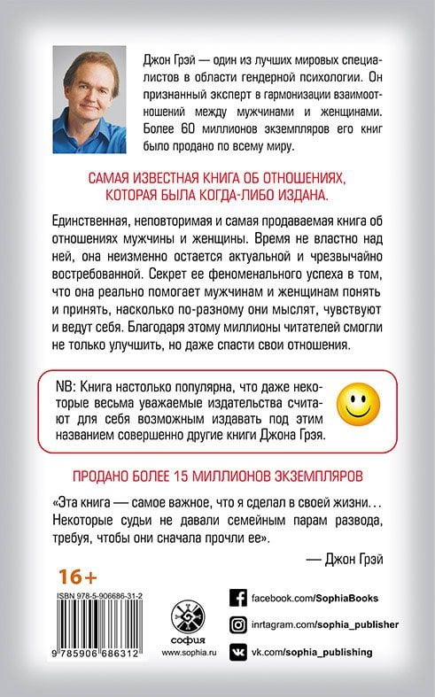 Единственная, неповторимая и самая продаваемая книга об отношениях мужчины и женщины. Время не властно над ней, она неизменно остается актуальной и чрезвычайно востребованной. Секрет ее феноменального успеха в том, что она действительно помогает мужчинам и женщинам понять и принять, насколько по-разному они мыслят, чувствуют и ведут себя. Благодаря этому миллионы читателей смогли не только улучшить, но даже спасти свои отношения.