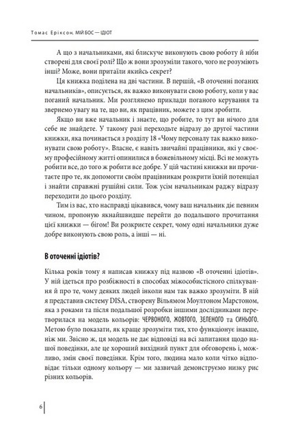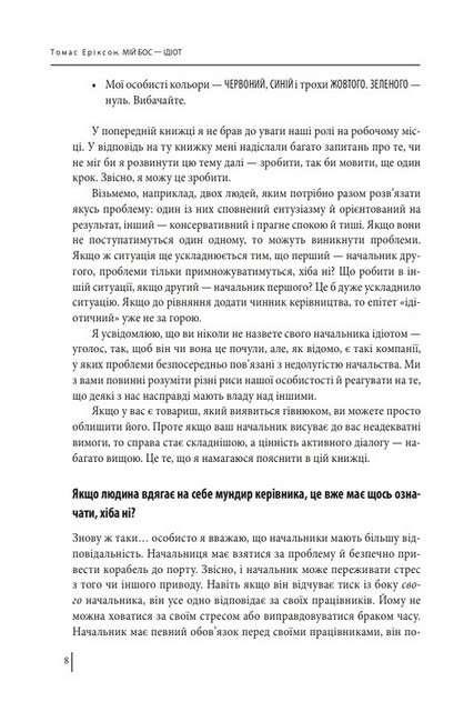 У книжці «Мій бос — ідіот» Еріксон поділяє начальство за способом їх керування, спілкування та поведінки на чотири кольорових типи — червоний, жовтий, зелений і синій. Він описує теорії та методи, за допомогою яких люди на своїх робочих місцях вибудовують функціональне діалогічне спілкування.