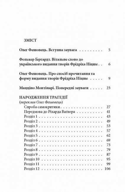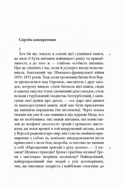 Цей том повного зібрання творів Фрідріха Вільгельма Ніцше (1844–1900) почасти відтворює перший том Критично-дослідницького видання (KSA) у 15 томах видатного німецького філософа, яке вперше з’явилося 1980 року й було підготовлене на основі укладеного Джорджо Коллі та Мацціно Монтінарі Критичного повного видання, що вийшло друком у видавництві «Вальтер де Ґройтер» у 1967-му та наступних роках. Цей том містить ранні твори — «Народження трагедії» та чотири «Невчасні міркування»: «Давід Штраус як сповідник і письменник», «Про користь і шкоду історіїдля життя», «Шопенгауер як вихователь» і «Ріхард Ваґнер у Байройті». Тут уважний читач має нагоду прочути основну — трагічну — тональність творчості філософа, що дозволить не заблукати в лабіринті його на позір хаотичного мислення.