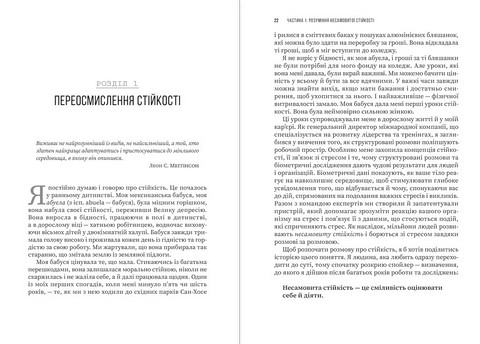 \nРозв’язання проблеми стресу полягає не в його уникненні, а в застосуванні ефективних стратегій керування ним. «Несамовита стійкість» — це книжка, яку варто прочитати кожному, хто хоче навчитися розпізнавати, аналізувати й долати стрес, використовуючи силу розмов.