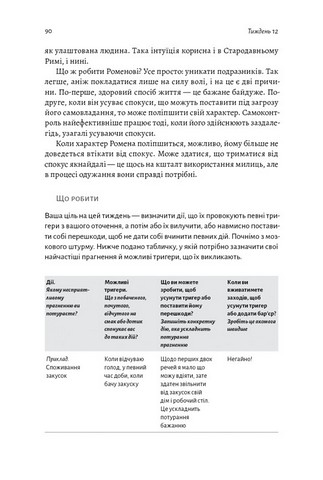 - Книжка розбита на 3 розділи — дисципліну бажання, дії та згоди. Завдяки такому поділу у вас буде можливість досягти змін в різних сферах вашого життя, зокрема розвинути силу волі, характер та досягти омріяного "дзену" в особистому та професійному житті.