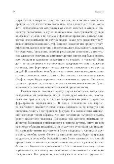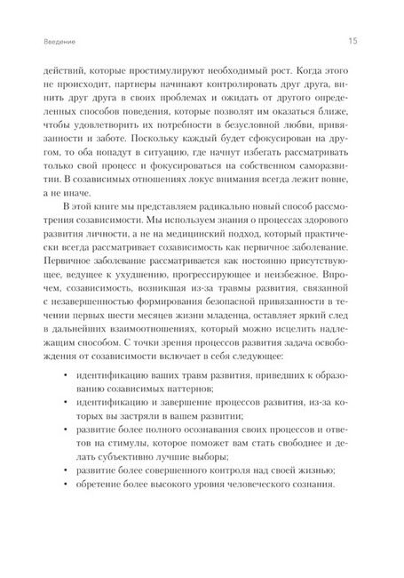 Созависимость — одна из самых распространенных проблем, мешающих полноценной жизни людей. Она касается не только отдельных личностей, но и общества в целом, которое создает условия, благоприятствующие созависимым отношениям и их передаче из поколения в поколение. Созависимые люди испытывают постоянную потребность в одобрении окружающих, поддерживают унижающие достоинство отношения и чувствуют себя бессильными что-либо изменить, не осознают своих истинных желаний и потребностей и не способны испытывать чувство настоящей близости и любви. Традиционная медицинская модель считает невозможным окончательное излечение от созависимости. Авторы этой книги утверждают обратное — на основе собственного опыта и многолетней успешной работы с клиентами. Они раскрывают причины и механизмы действия созависимых отношений, описывают способы избавиться от них, а главное — вселяют надежду на выздоровление. Действенные методы, предлагаемые Берри и Дженей Уайнхолд, обогатят инструментарий практикующих психологов и психотерапевтов и послужат эффективным средством самопомощи и взаимной помощи для их клиентов. Результатом этой нелегкой работы станут по настоящему близкие и продуктивные отношения.