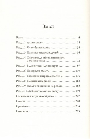 Після раптової смерті чоловіка Шерил Сендберґ усвідомила, що вона та її діти більше ніколи не відчують справжньої радості. «Я перебувала у вакуумі, - пише вона, - у безкраїй порожнечі, що заповнює серце й легені й обмежує здатність мислити чи навіть дихати». Однак її друг Адам Ґрант, психолог із Вортонськоі школи, пояснив, що для відновлення після досвіду, який руйнує все життя, варто зробити три кроки. Наша витривалість не є незмінною від народження. Вона - м’яз, що його може наростити кожен.