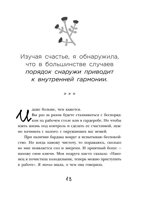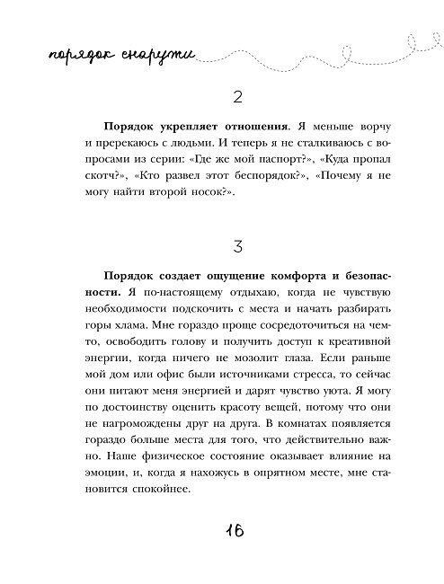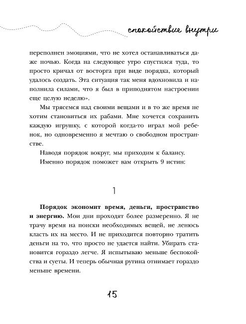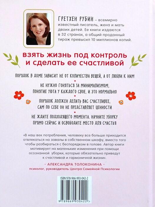 Гретхен Рубин много лет изучает счастье: читает труды философов, следует советам психологов, анализирует свои ощущения и достижения. И вот она обнаружила, что внутренняя гармония намного больше зависит от чистоты и порядка, нежели считалось ранее. «Наш дом формирует наши мысли, а вещи влияют на настроение» – уверенна она. В книге «Порядок снаружи, спокойствие внутри» Гретхен Рубин написала об изменениях в своей жизни после того, как она избавилась от ненужных вещей и привела дом в порядок. А еще читать найдет 5 стадий наведения порядка и много полезных советов.