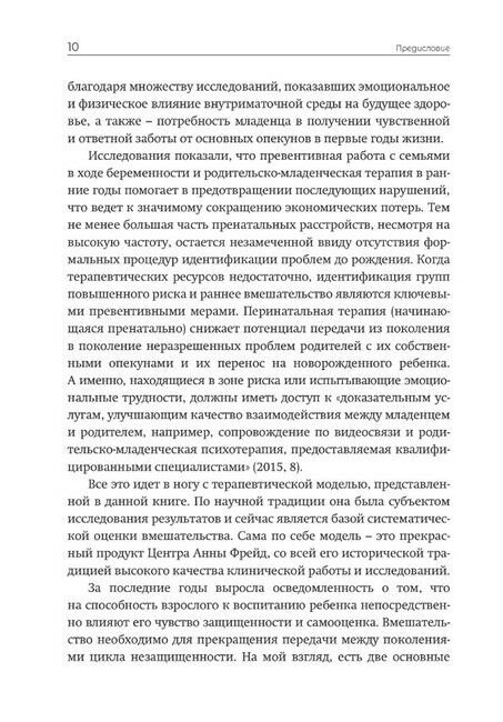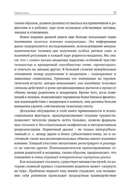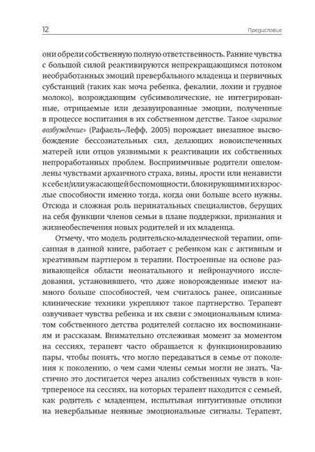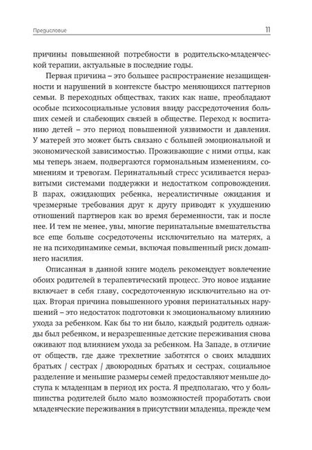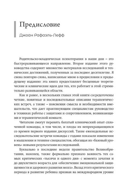 Книга, написанная опытными психотерапевтами, содержит фундаментальные аспекты доказательной базы, теории и практики родительско-младенческой психотерапии (Parent-Infant Psychotherapy, PIP) – современной психоаналитической психотерапии ранних детско-родительских отношений. Привлекая клинический материал и результаты исследований в области нейронаук, теории привязанности и психоанализа, книга представляет актуальный, гибкий и глубокий терапевтический подход. Психологи и психотерапевты, как начинающие, так и опытные, найдут в ней много ценного для своей ежедневной работы и профессионального развития. Книга также может быть полезна широкому кругу специалистов, работающих с детьми и семьями (врачам, педагогам, логопедам, социальным работникам, реабилитологам и др.), а также – студентам этих специальностей. Несмотря на свою профессиональную направленность, эта книга может также привлечь внимание родителей, интересующихся психологией и современными возможностями помощи развитию маленьких детей.