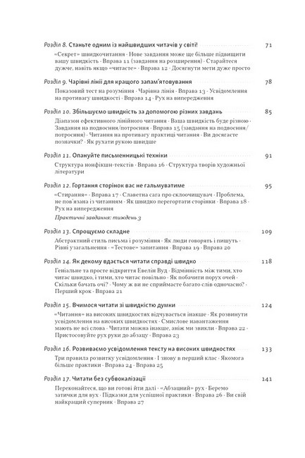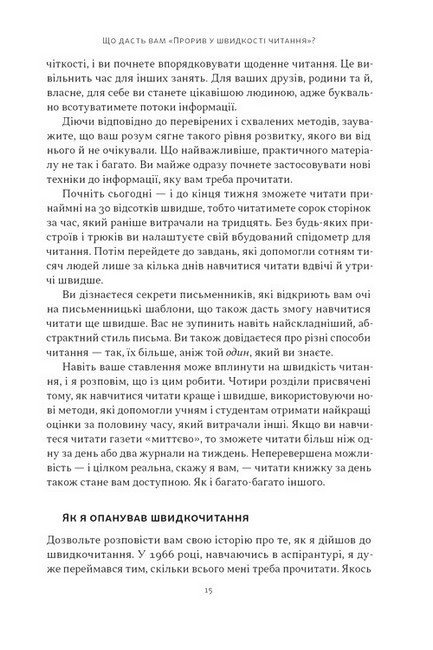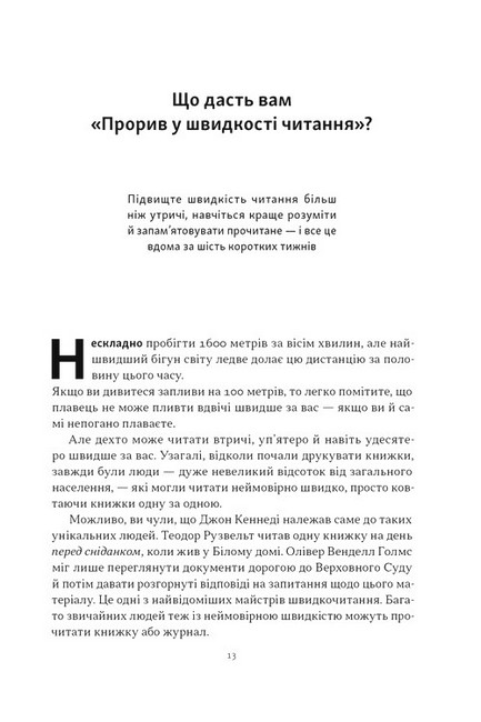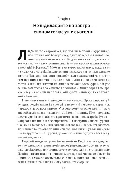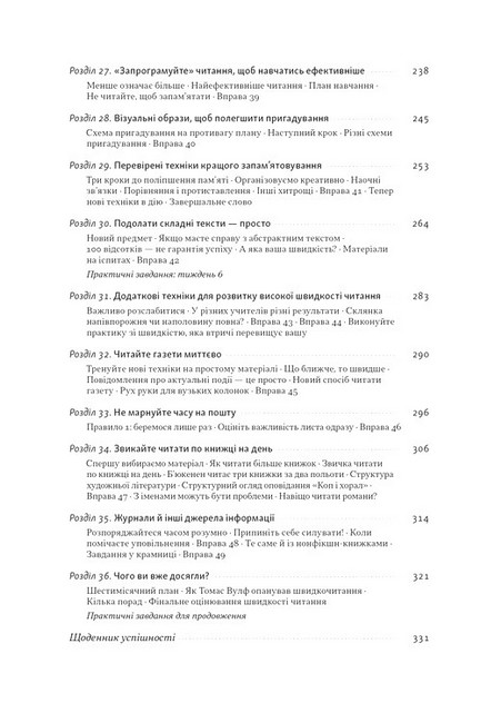 Американський президент Теодор Рузвельт устигав «ковтнути» книжку перед сніданком. Інвестор Ворен Баффет прочитує по 500 сторінок щодня. Засновник Microsoft Білл Ґейтс щотижня перегортає останню сторінку цікавого йому видання. У чому таємниця їхнього супервстигання? Автор цієї книжки переконує, що таких результатів можна досягнути, опанувавши техніку скорочитання.