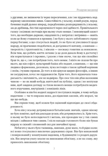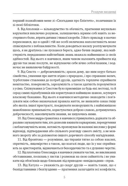 «Роздуми наодинці» — це особисті записи римського імператора Марка Аврелія Антоніна, зроблені ним в 70-і рр. нової ери. Імператор вів щоденник, де розмірковував щодо понять громадянськості, обов’язку, честі, совісті, вірності і справедливості. На сторінках цього надзвичайного документа ми спостерігаємо напружену роботу особистості з опанування філософії стоїків та з практичного розвитку стоїчної традиції. Таким чином, щоденник Марка Аврелія — один з перших в історії людства приклад літератури про самовдосконалення. Тому «Роздуми наодинці» Марка Аврелія стали однїєю з найбільш популярних пам’яток світової літератури. Творчість античного філософа і керівника імперії приваблює сучасних читачів мудрими міркуваннями, образністю і часом напрочуд актуальними практичними рекомендаціями.