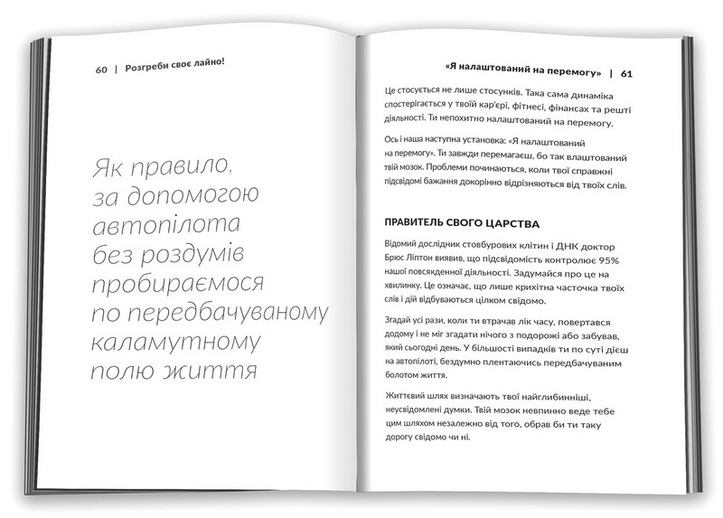 Автор пропонує своїм читачам максимально простий підхід для досягнення щастя - управління внутрішнім монологом! Ґері Джон Бішоп - експерт з питань саморозвитку світового класу, стверджує: кожна людина розмовляє з собою, і від того, як вона це робить, залежать її кар'єра, рівень доходу, сімейне життя та інші маркери особистого успіху.