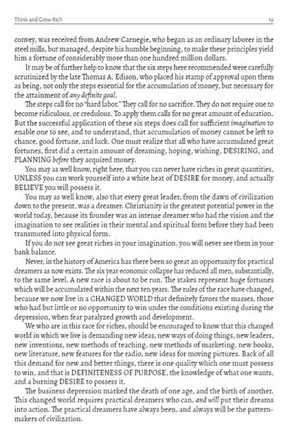 A winning formula for money-making success: Napoleon Hill’s classic thirteen-step path to riches. Napoleon Hill, America’s most beloved motivational author, devoted 25 years to finding out how the wealthy became that way. After interviewing over 500 of the most affluent men and women of his time, he uncovered the secret to great wealth based on the notion that if we can learn to think like the rich, we can start to behave like them. By understanding and applying the thirteen simple steps that constitute Hill’s formula, you can: achieve your goals change your life, and join the ranks of the rich and successful.