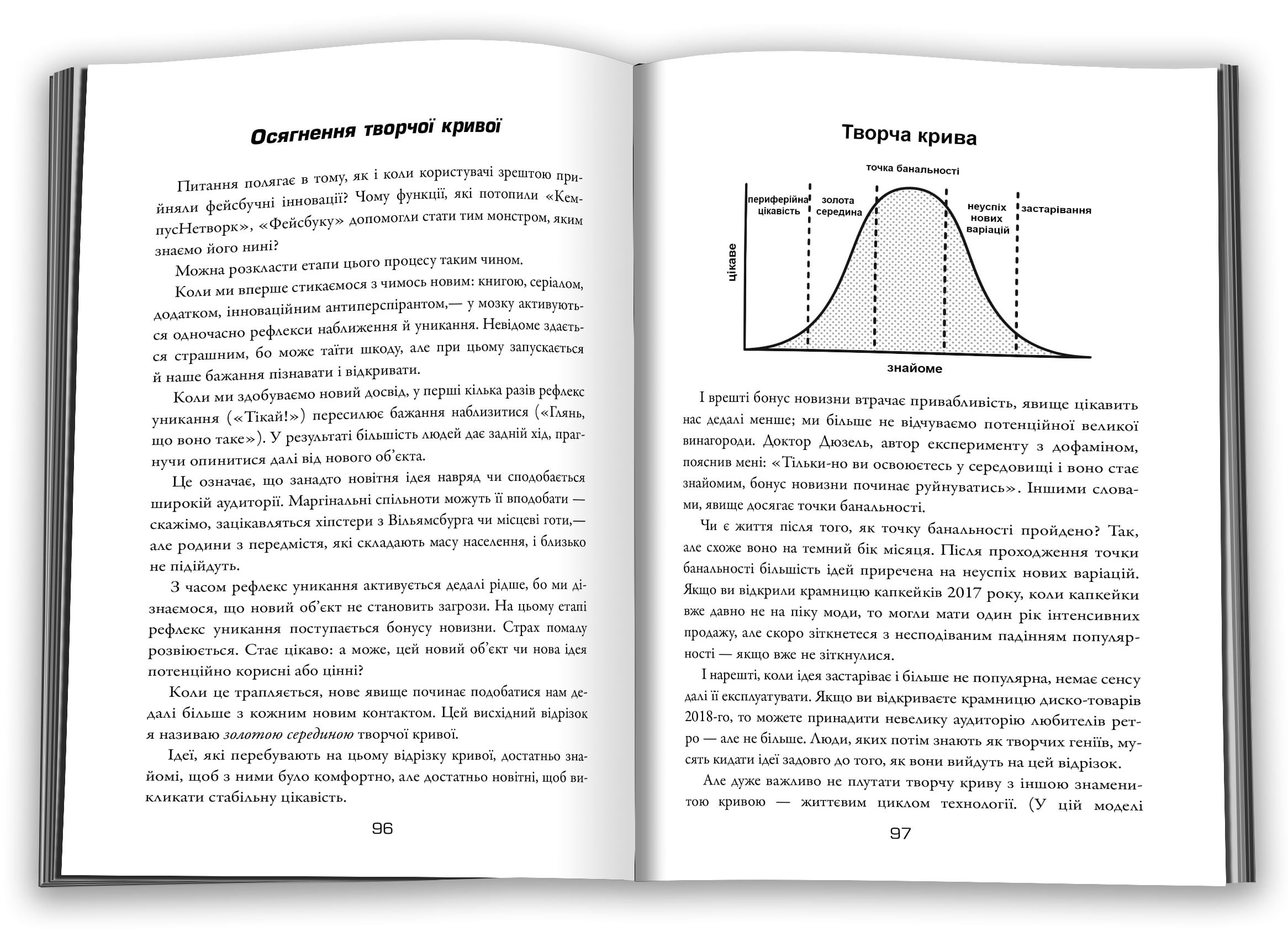 Нас довго переконували, що творчість — царина геніїв, результат непередбачуваного натхнення. Дар або є, або його немає. Одначе сучасні дослідження доводять, що у будь-якій творчій сфері — від написання бестселерів до заснування прибуткових компаній — комерційний успіх має тверде наукове підґрунтя. Розуміючи специфіку так званої творчої кривої — оптимального поєднання нового і знайомого, будь-хто може досягти комерційного успіху. Аналізуючи історії відомих людей, Ґаннет знайомить читача з чотирма законами творчого успіху й доводить, що за всіма видатними досягненнями стоять спільні закономірності.
