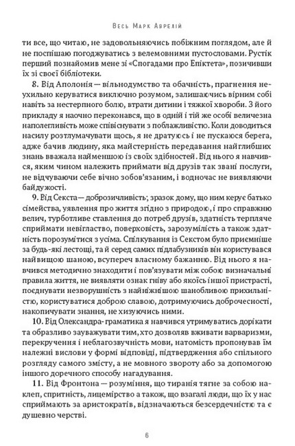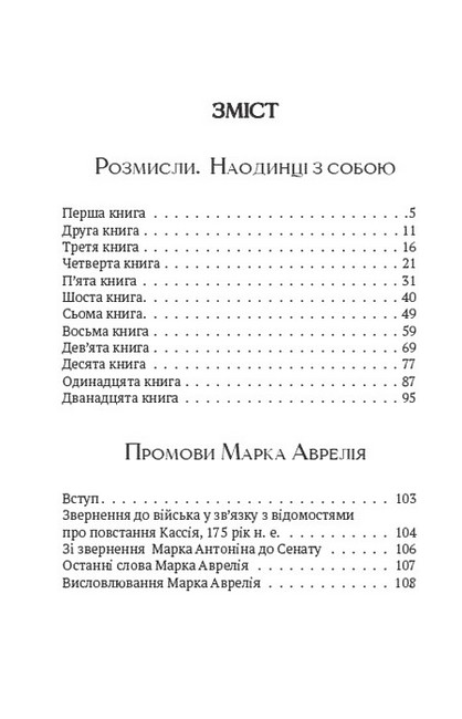 До цієї збірки увійшли всі твори, що вийшли з-під пера Марка Аврелія Антоніна та дійшли до наших днів. Це хрестоматійні «Розмисли. Наодинці з собою», три виголошені ним промови, окремі вислови імператора-філософа та описи яскравих епізодів його життя а також імператорський едикт щодо ставлення до християн. Творчість імператора, котрий сповідав стоїцизм, приваблює сучасних читачів гуманістичними поглядами, мудрими міркуваннями і на подив актуальними моральними рекомендаціями.