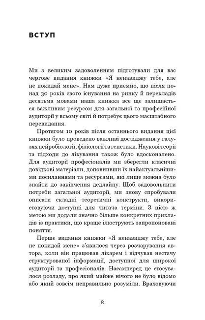 «Я ненавиджу тебе, але не покидай мене» — доповнене й оновлене видання психологічного бестселера, який дає змогу зрозуміти людей із емоційно нестабільним розладом особистості. Автори доступно пояснюють нейробіологічні та генетичні передумови розвитку цього розладу і його зв’язок із алкогольною й наркозалежністю, сексуальними зловживаннями, ПТСР, СДУГ тощо. У книзі подано інформацію про фармакологічну й психологічну терапії, а також поради щодо того, як скористатися набутою інформацією, щоб глибше зрозуміти «важких» людей і налагодити стосунки з ними.