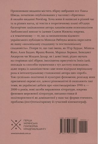 Пропоноване видання містить збірку вибраних есе Павла Шведа, початково опублікованих у часописі «Критика» й онлайн-виданні Provid.org. Хоча вони й написані в різний час та за різних нагод, ці тексти в теоретичному плані об'єднує багаторічне зацікавлення автора лаканівським психоаналізом Люблянської школи та ідеями Славоя Жижека зокрема, а в тематичному — те, що за визначенням відомого українського публіциста Миколи Рябчука можна окреслити як нашу «колоніальну спадщину та постколоніальну спадковість». Попри те, що такі імена, як П'єр Бурдьє, Мішель Фуко, Ален Бадью, Франц Фанон, Маршал Берман, Бенедикт Андерсон чи Младен Долар, як і деякі інші, рідко звучать на сторінках цієї збірки, імпліцитна присутність їхніх ідей, поглядів та способів тлумачення є тут достоту повсюдною, адже поряд із лаканіанством саме вони відіграли вирішальну роль в інтелектуальному становленні автора цих «проб».